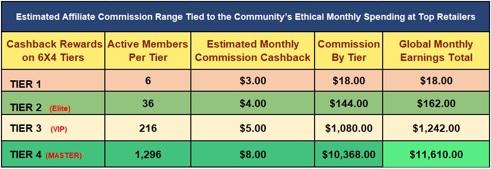 This model is designed to be based on: Community-wide purchasing activity, Sustainable affiliate commissions, Ethical, everyday spending at top retailers.